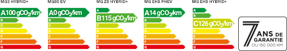 Consommation (cycle mixte WLTP) Gamme MG3 Hybrid+ : 4,4l/100 km - Émissions de CO2 (cycle mixte WLTP) : 100 g/km. Consommation (cycle mixte WLTP) Gamme MG ZS Hybrid+ : 5 - 5,1 l/100 km - Émissions de CO2 (cycle mixte WLTP) : 113-115 g/km. Consommation (cycle mixte WLTP) Gamme nouveau MG EHS : 0,5 -5,5 l/100 km - Émissions de CO2 (cycle mixte WLTP) : 14 - 126 g/km. Règlement 2018/1832. Valeurs susceptibles d'évolution. Plus d'informations sur le site www.mgmotor.fr.