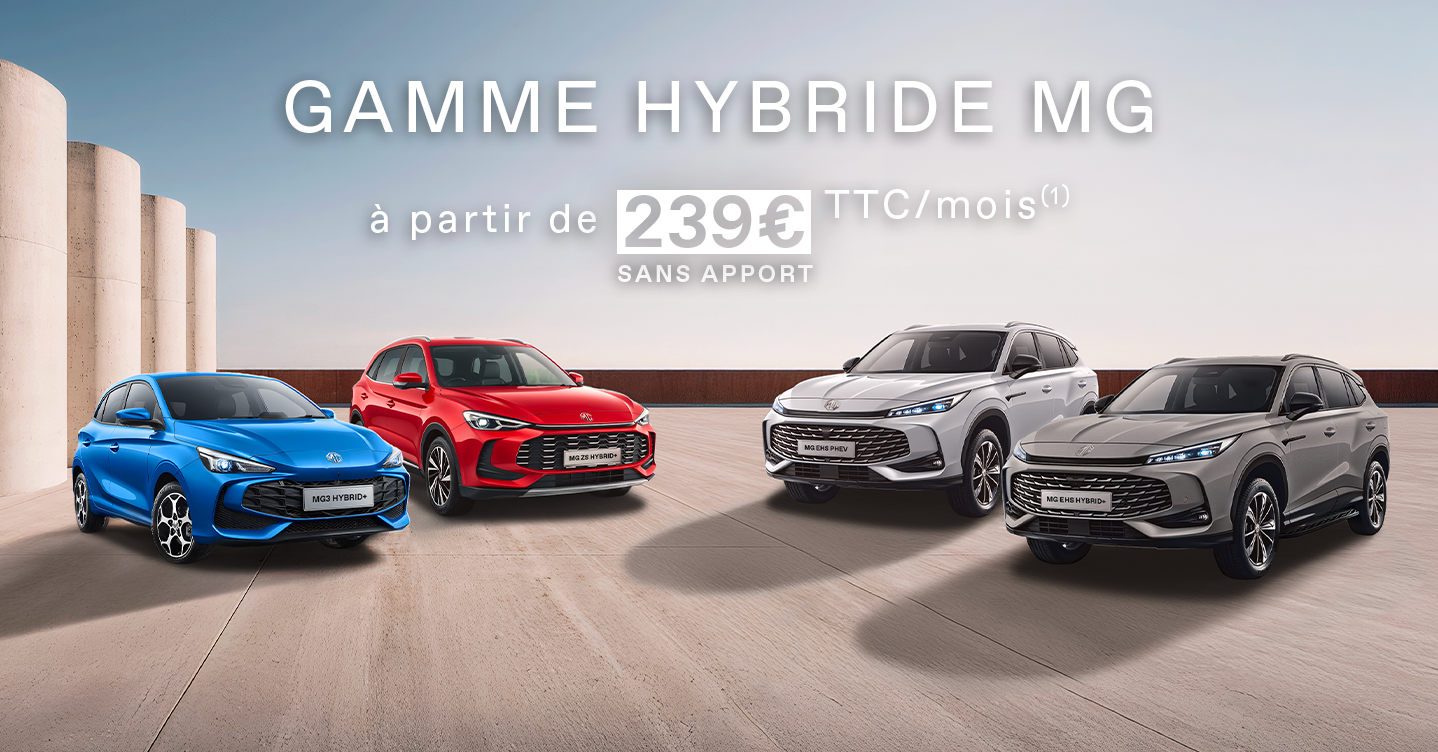 (1) Exemple pour une MG3 Hybrid+ Standard neuve hors option en Location Longue Durée sur 49 mois et 40 000 km maximum soit 49 loyers mensuels de 239 € TTC. Offre non cumulable réservée aux particuliers pour toute commande d'un véhicule en LLD jusqu'au 31/12/2025 et livré / facturé au plus tard le 31/01/2026, dans la limite des stocks disponibles et dans le réseau participant en France métropolitaine et Corse, sous réserve d'acceptation par DRIVALIA Lease France, SA au capital de 68 954 580,86 €, 1 Rue Victor Basch - 91300 MASSY, 342 499 126 RCS Evry. Intermédiaire d'assurance inscrit à l'ORIAS sous le N° 12 066 654 (www.orias.fr).
